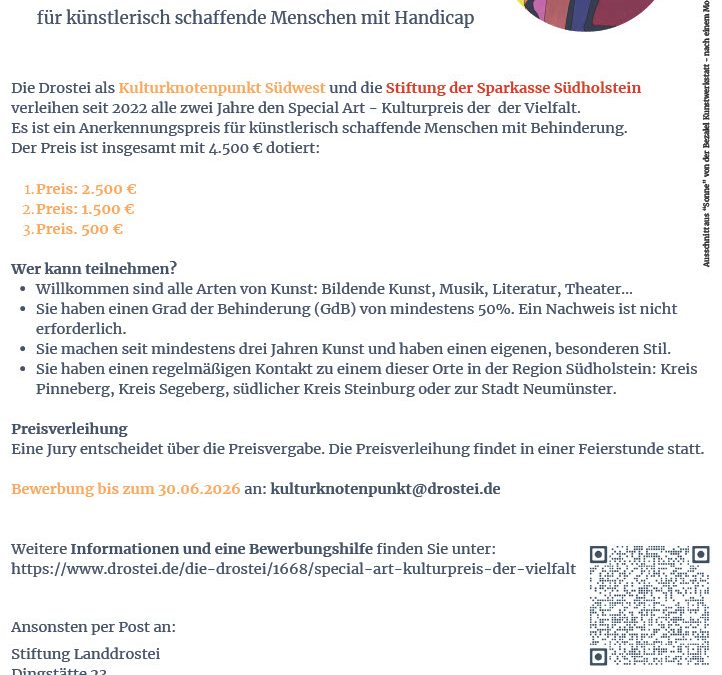 Die Drostei als Kulturknotenpunkt Südwest und die Stiftung der Sparkasse Südholstein verleihen seit 2022 alle zwei Jahre den „Special Art – Kulturpreis der Vielfalt“. Es ist ein Anerkennungspreis für künstlerisch schaffende Menschen mit Behinderung. Der Preis ist insgesamt mit 4.500 € dotiert: